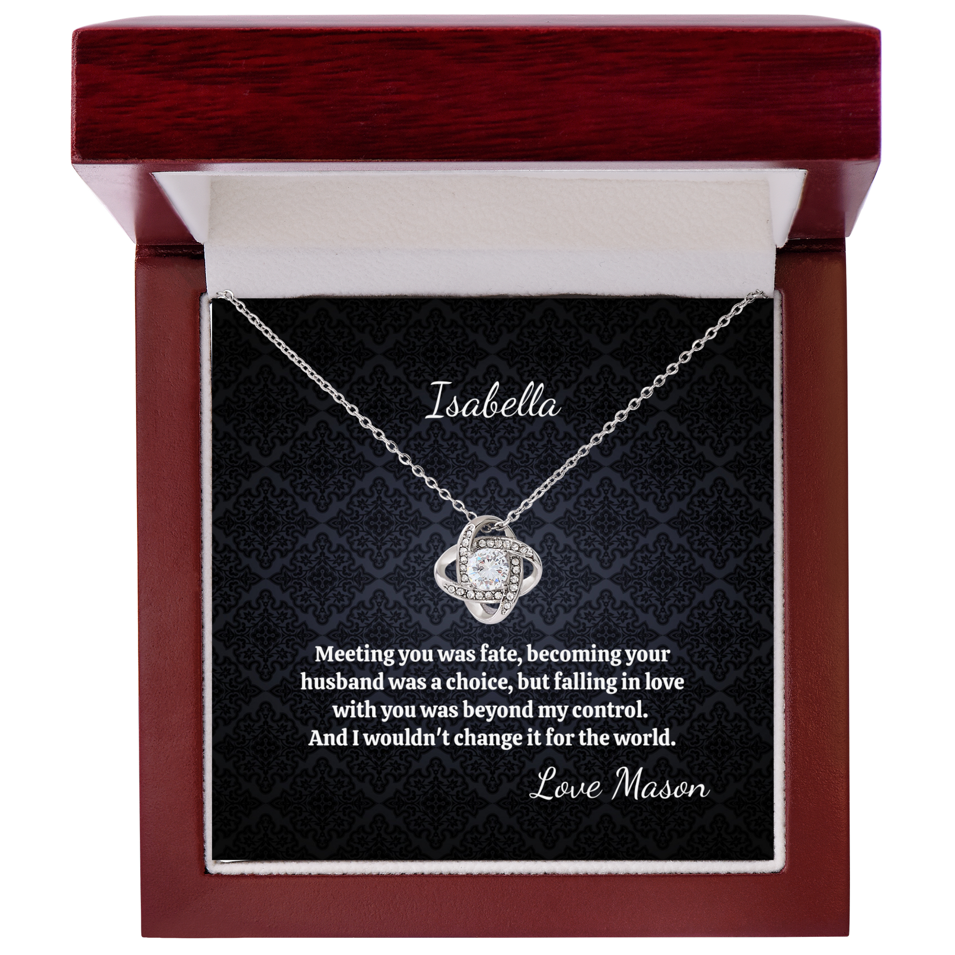 You saw her once and fate did the rest. Make her day with this necklace that reminds her just how perfect your timing was. Both of your names are added to the message card so every glance at it says “you were meant to be together.”